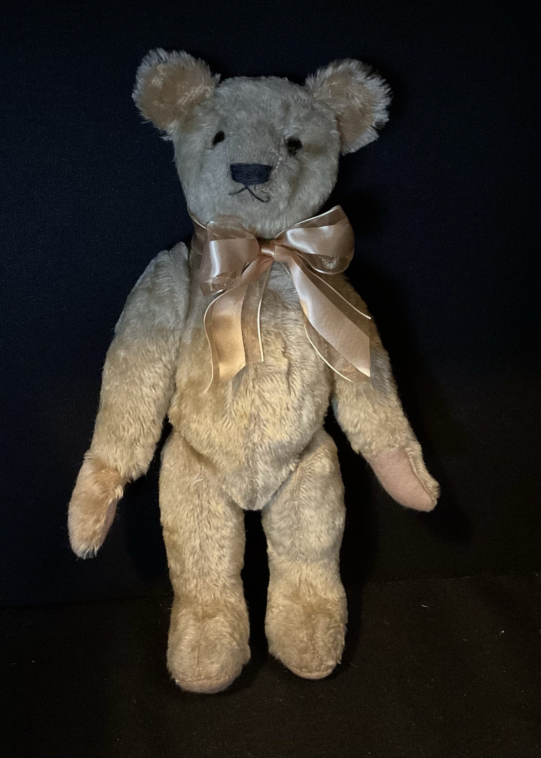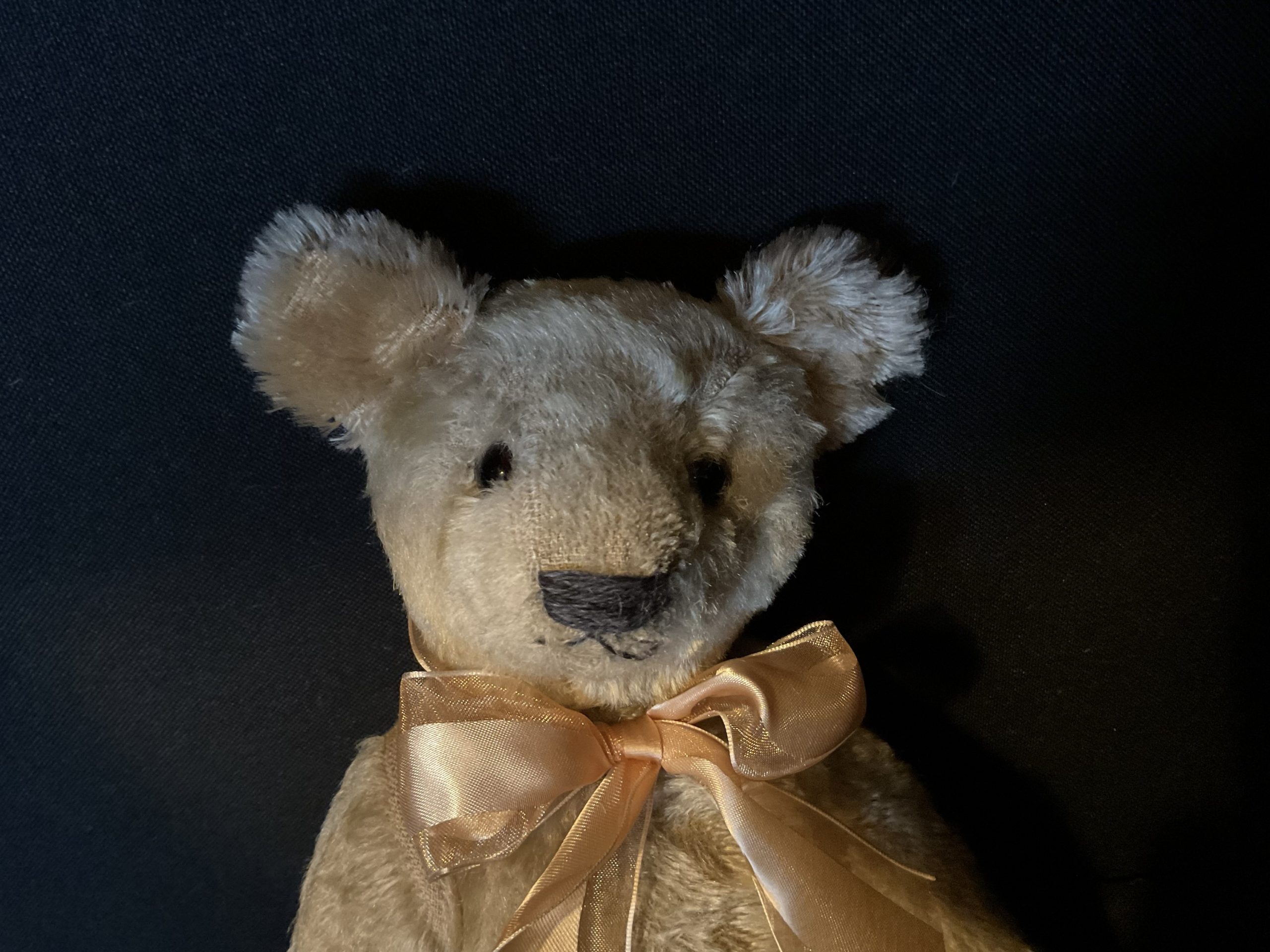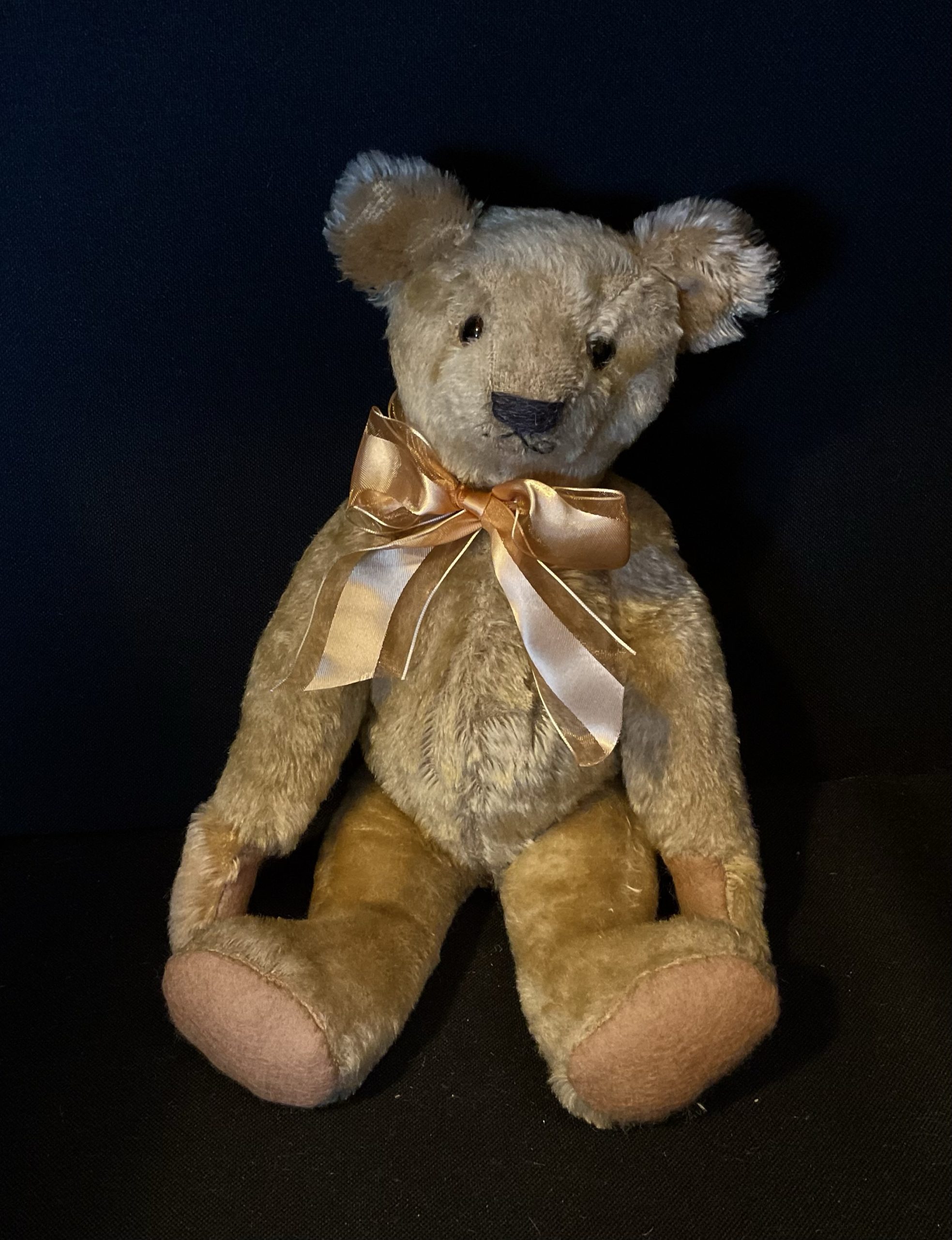 ‘Alf’ This vintage mohair bear came to me deaf (no ears) and blind (no eyes) and with half an arm missing! He has now been fully treated and rehabilitated ready for a new home. Lots of long golden mohair, glass eyes, wool felt pads, fully jointed, cleaned. He is of mystery make as I cannot identify his origin but he shows characteristics of various well known makers. Wood wool filled head and kapok to body. Stands at approximately 38cm tall.