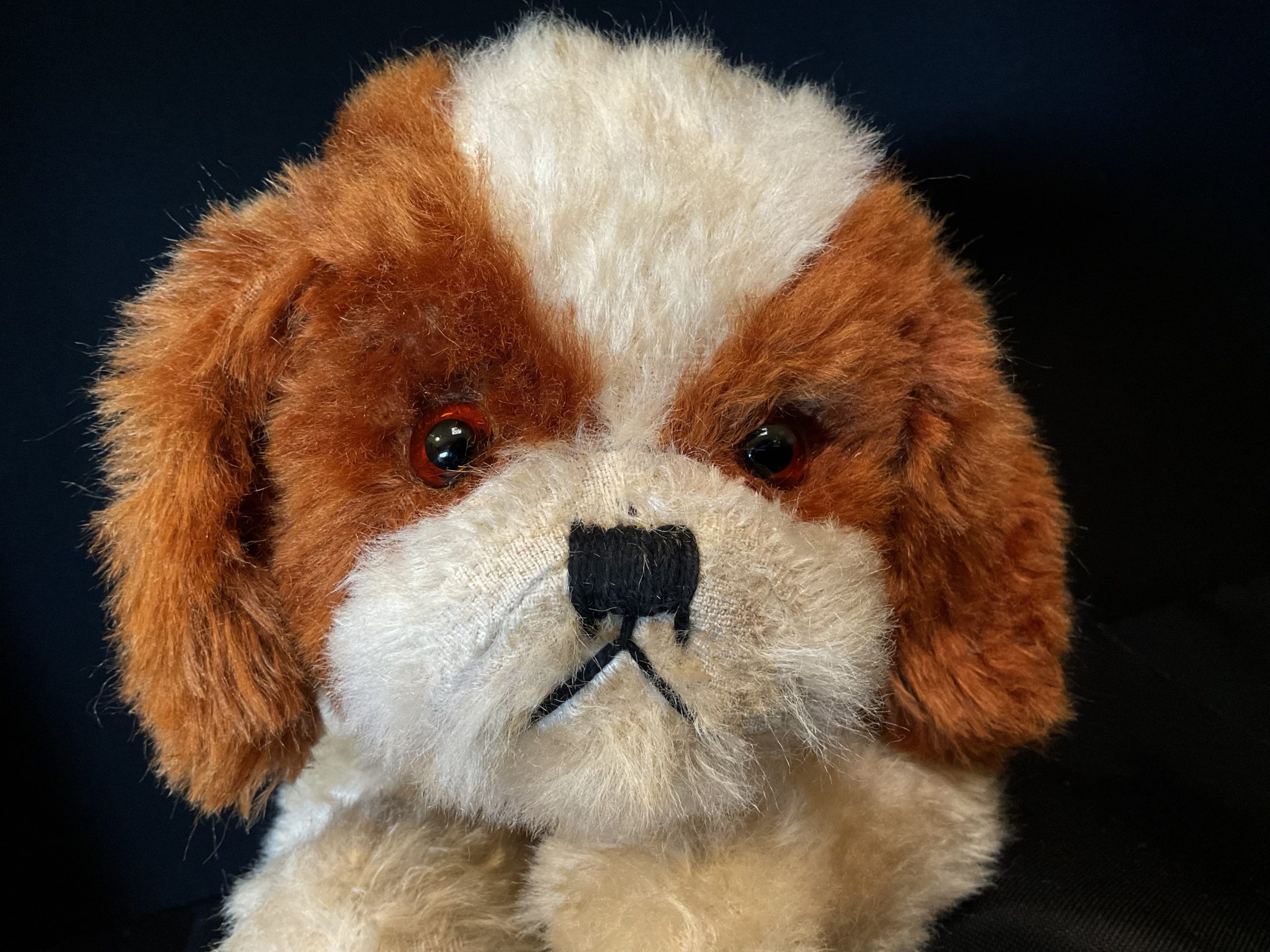 Bella Vintage mohair dog in cream and brown. Such a beautiful face with her glass eyes. Possibly was a pj case in her youth but has been filled and sewn up. Height approximately 22cm Cleaned and brushed. Moth treated and ready for. New lap to sit in.