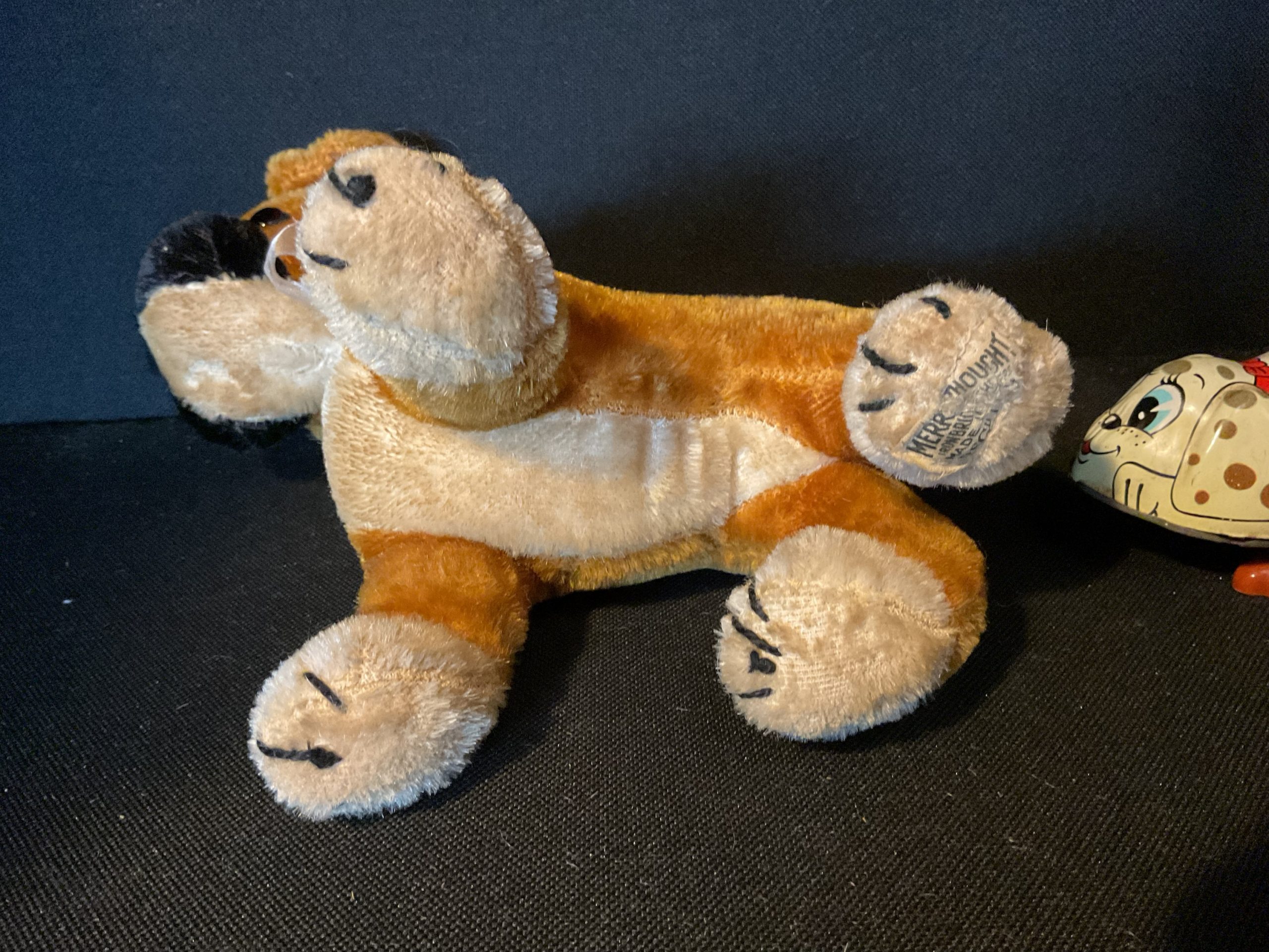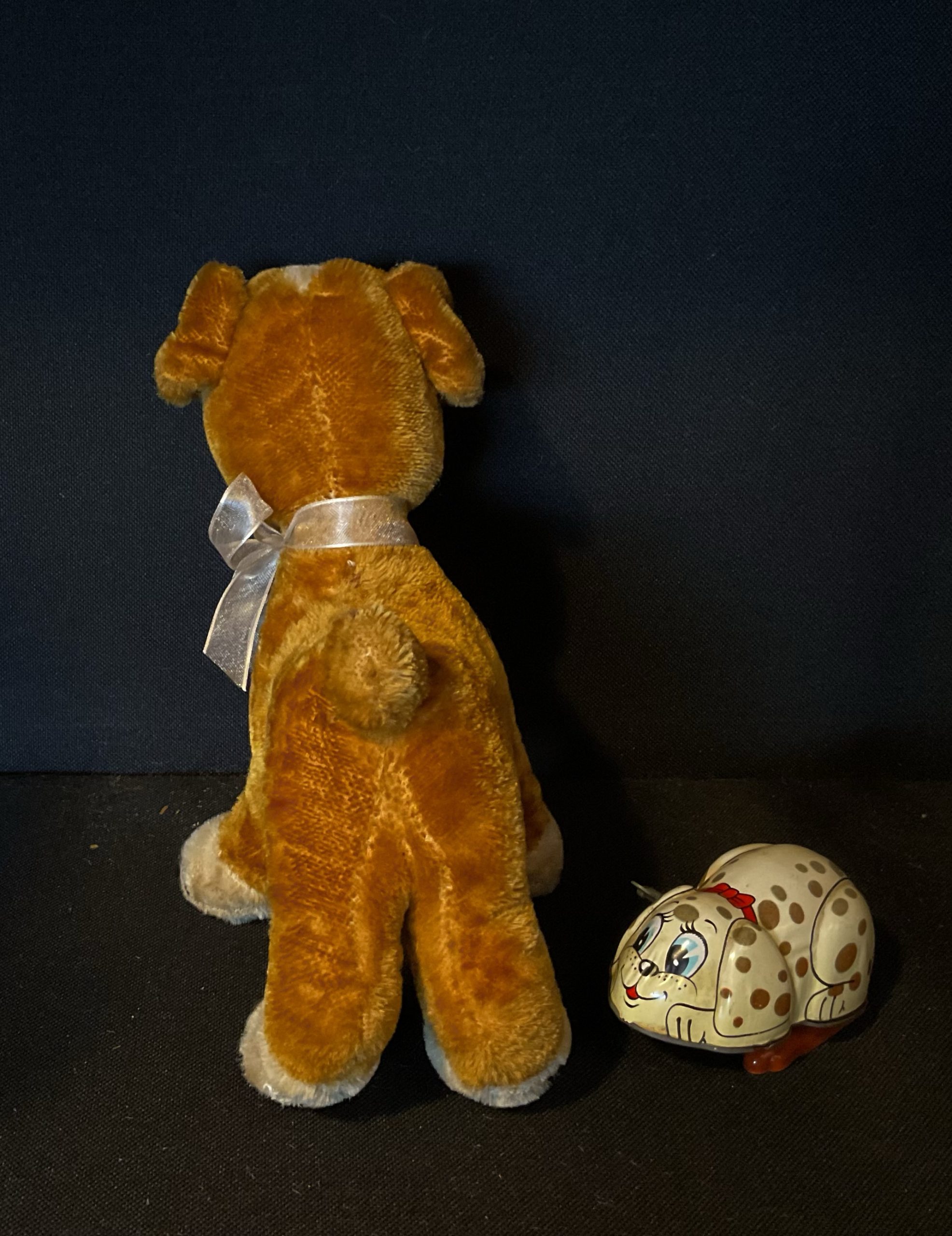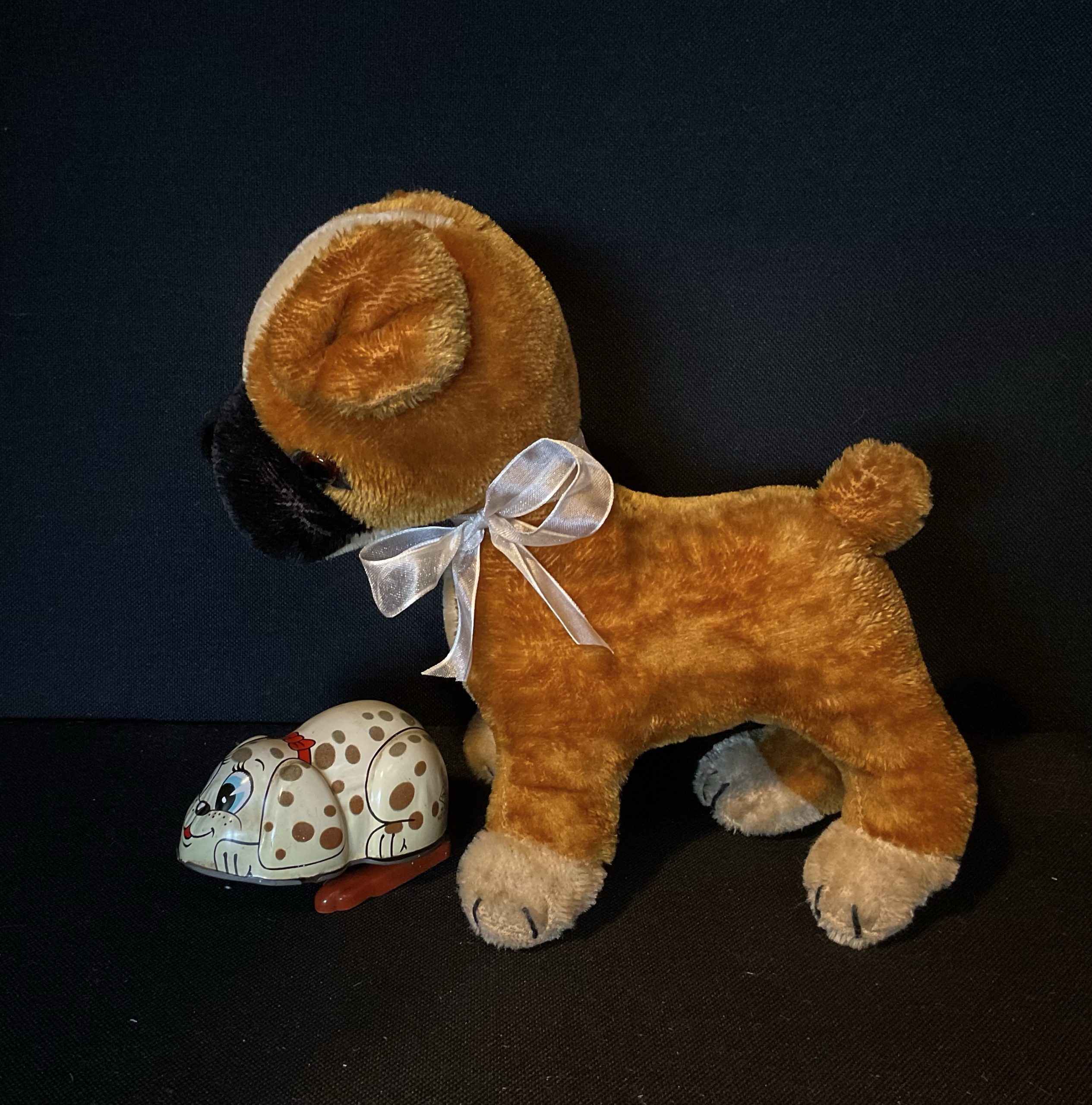 Boxer pup Merrythought 1960s labelled mohair dog, glass eyes. Cleaned checked over, housetrained. Stands at aprox 21cm