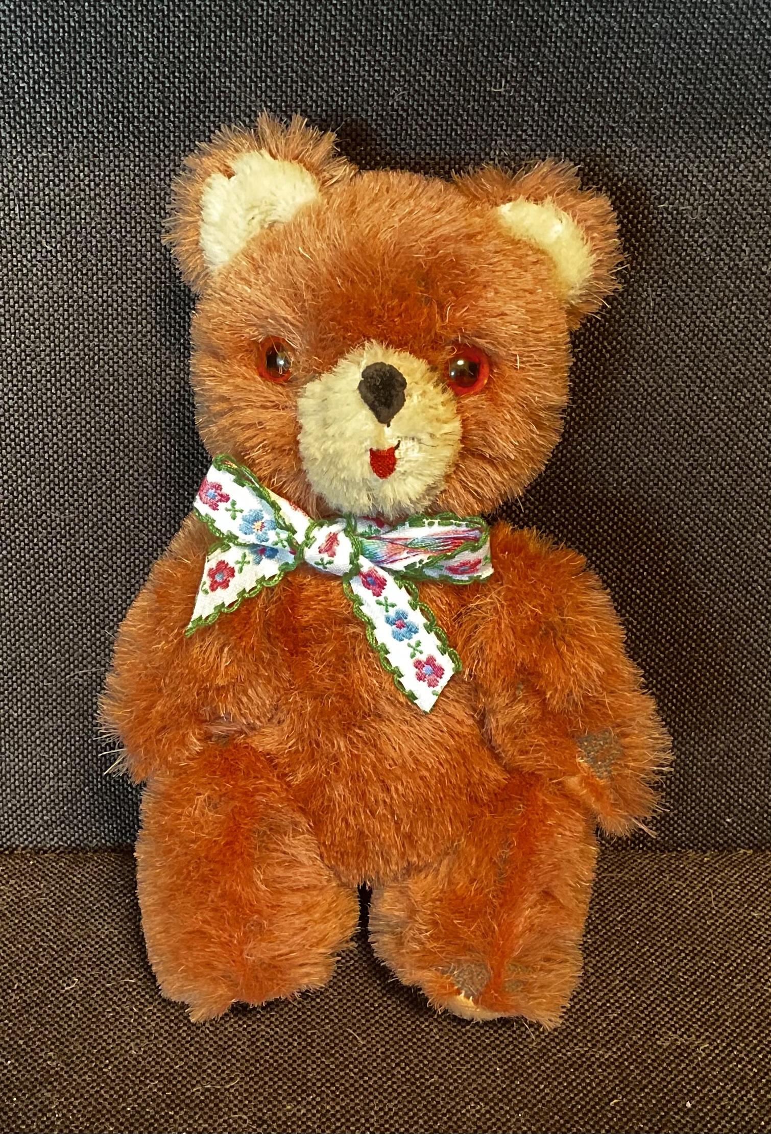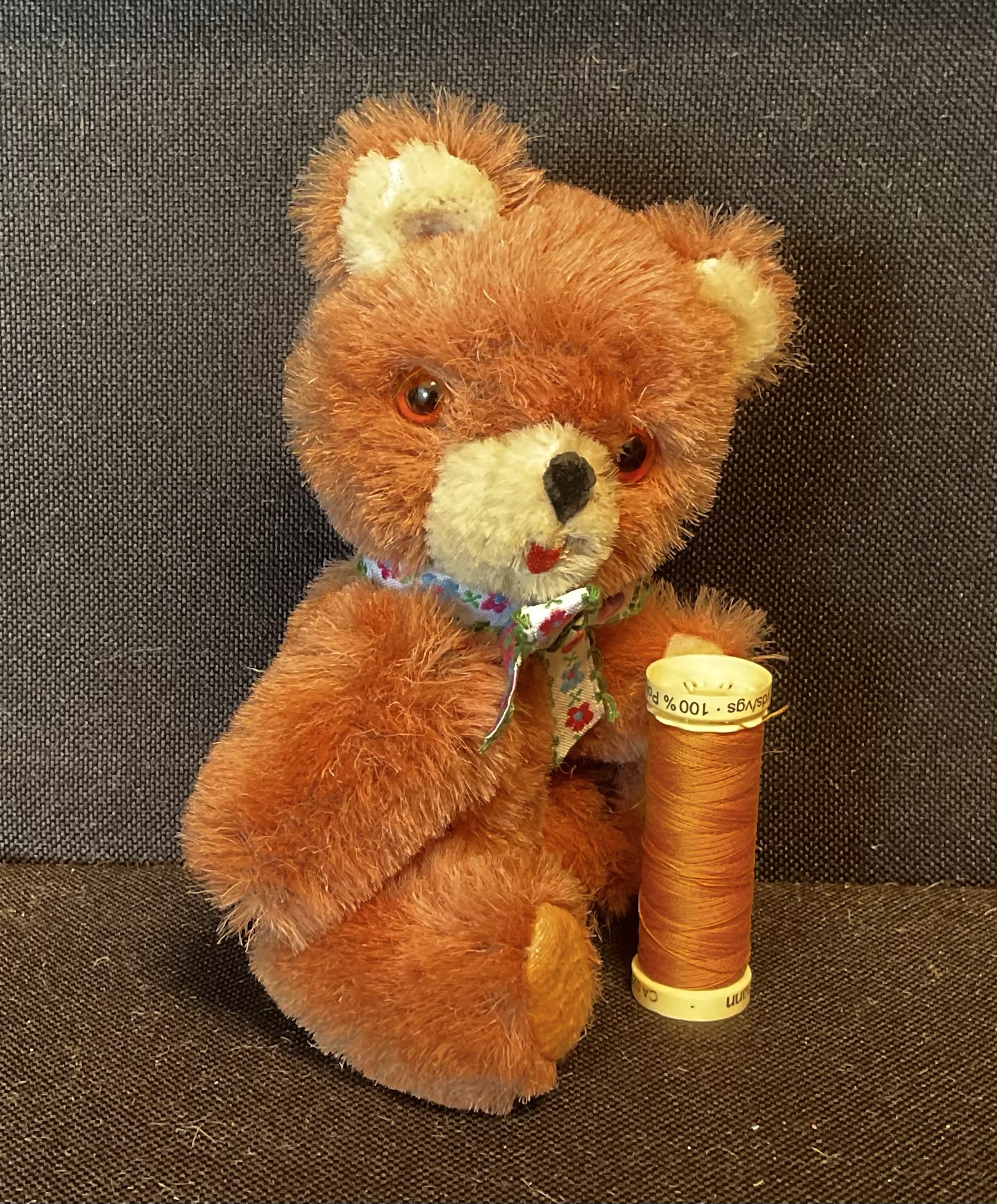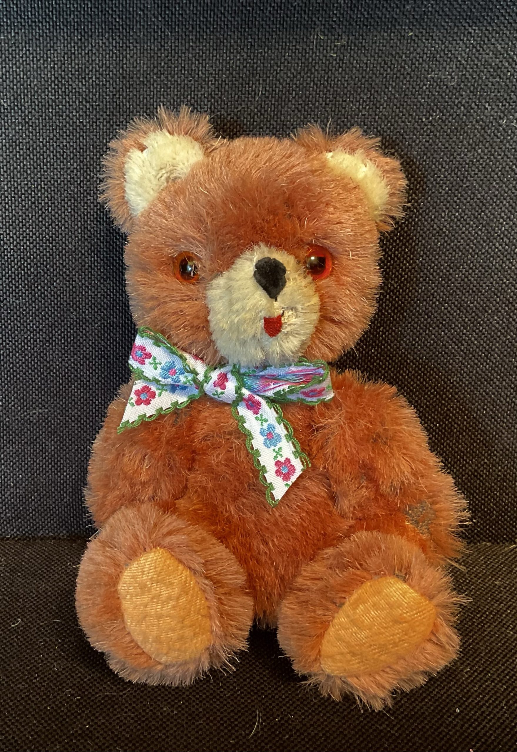 Busby Vintage 1960/70s Shanghai doll factory wool/mohair mini fully jointed bear. Some fading has made his dark brown fur rather pinkish now. Only 15cm tall. Mischievously has his tounge out. Ideal handbag trouble maker!