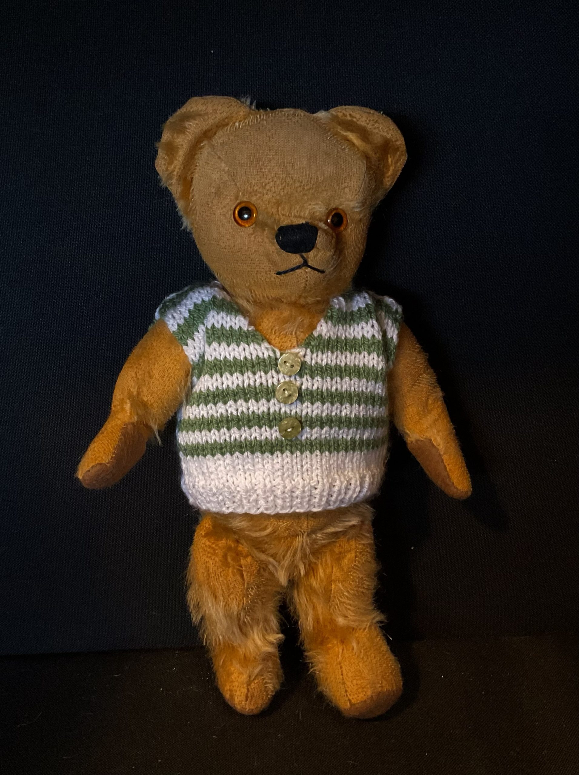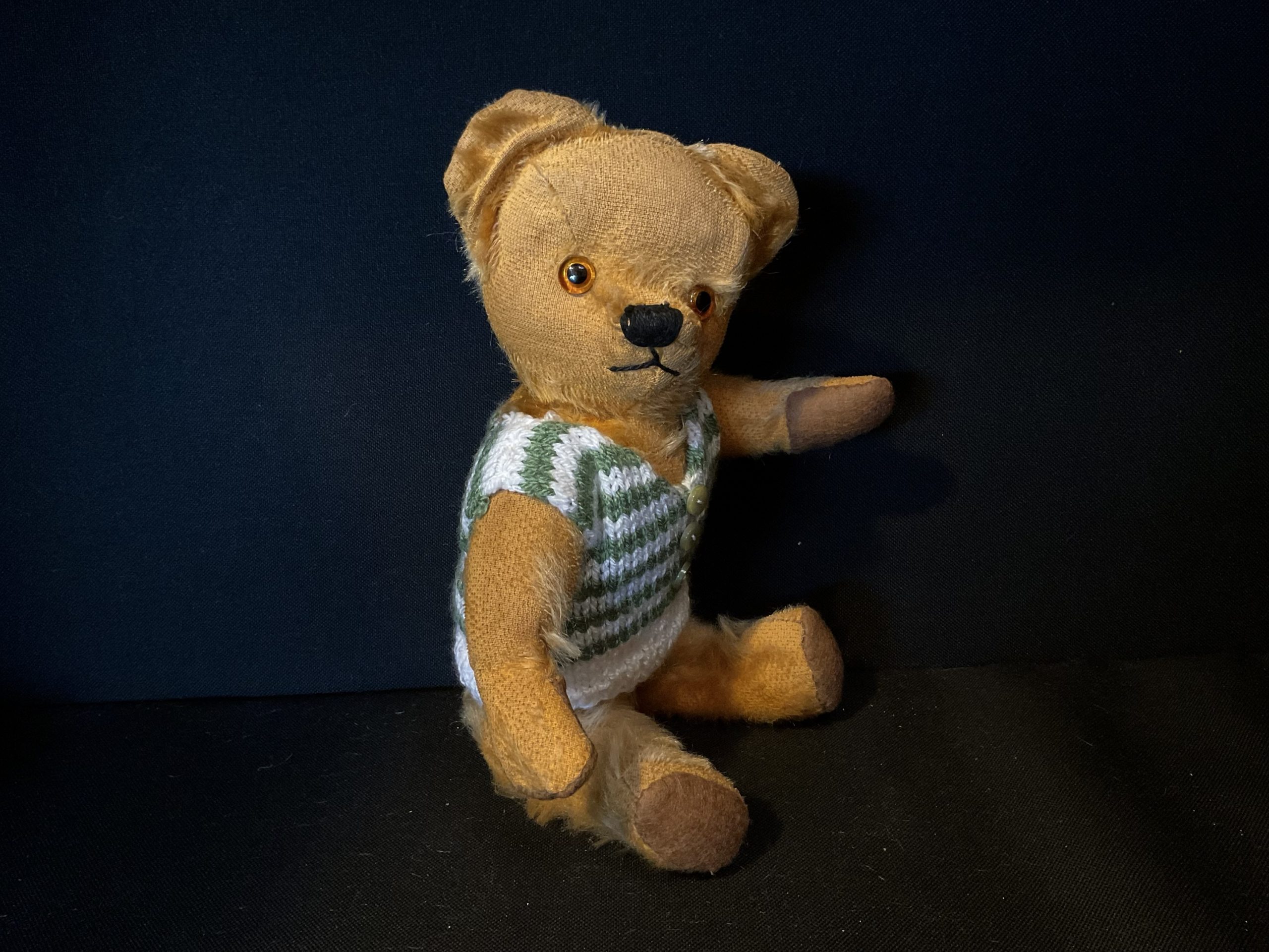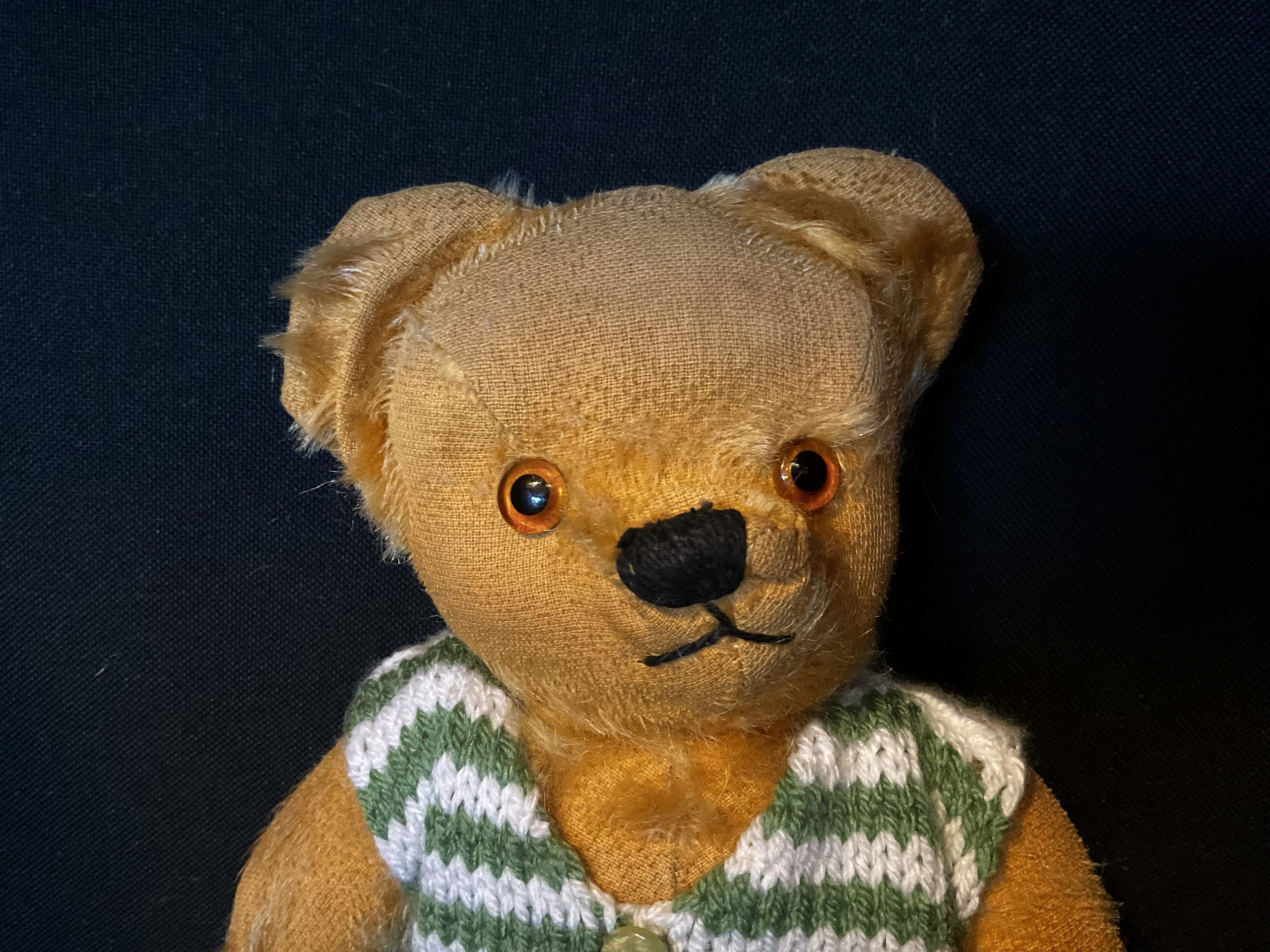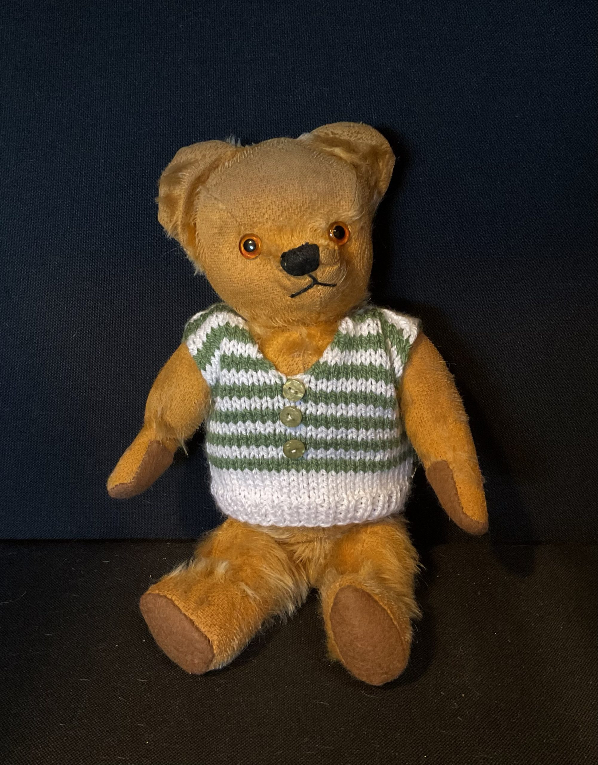 Buster 1950s Chad Valley fully jointed mohair bear. Glass eyes, wool felt renewed pads. Cleaned and checked over ready to boss everyone about. Wears hand knit tank top. Stands at 33cm approximately.