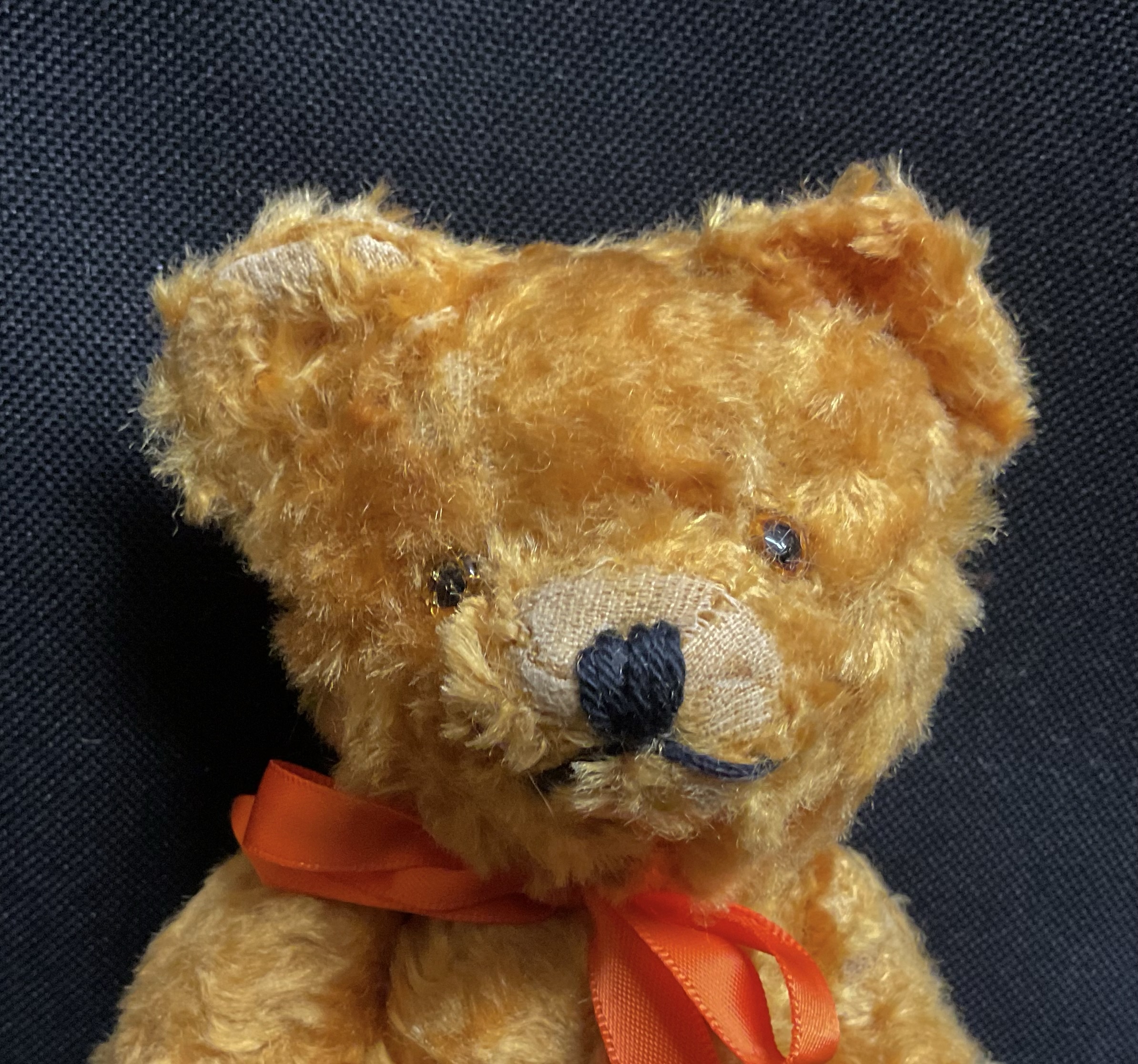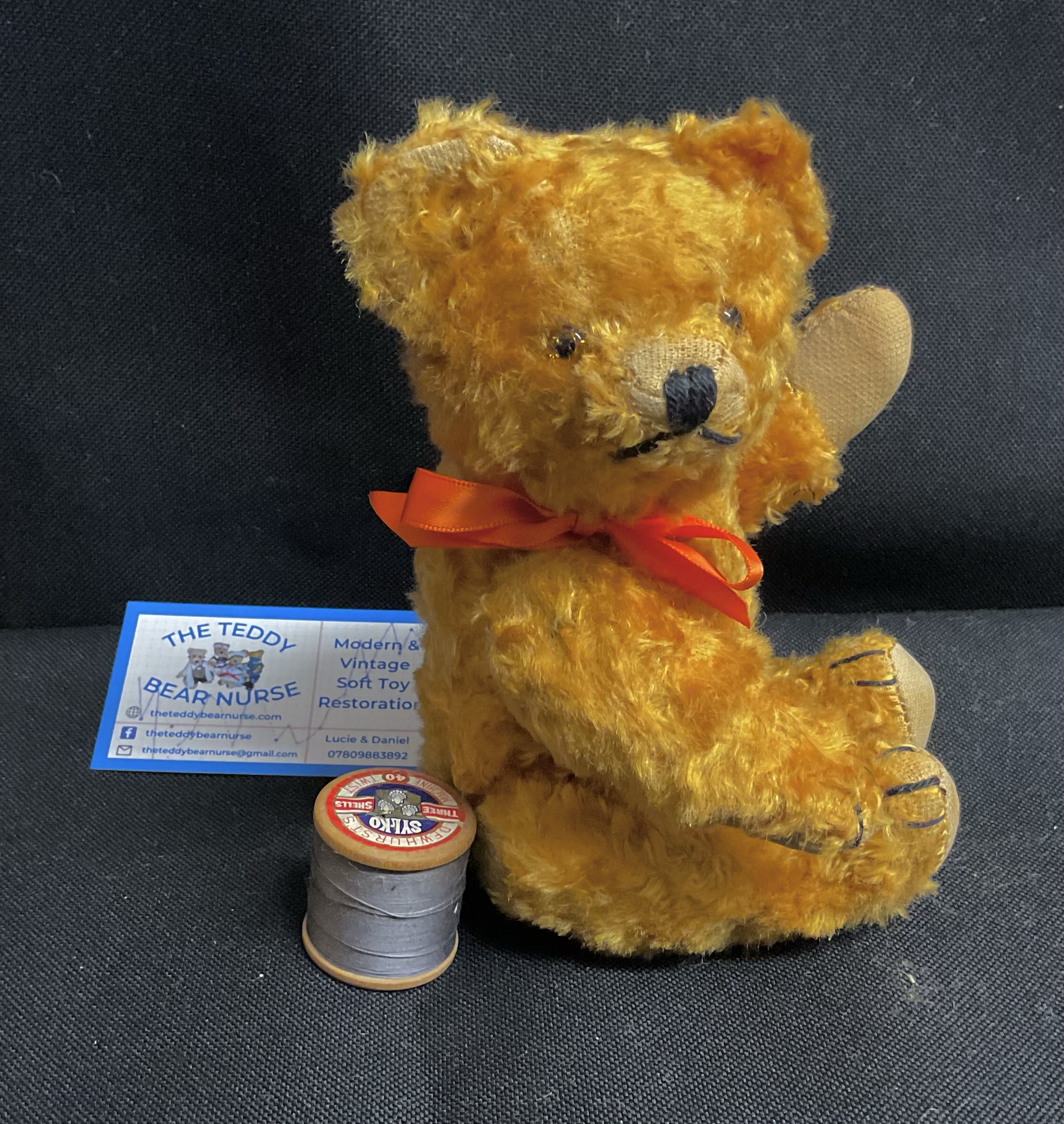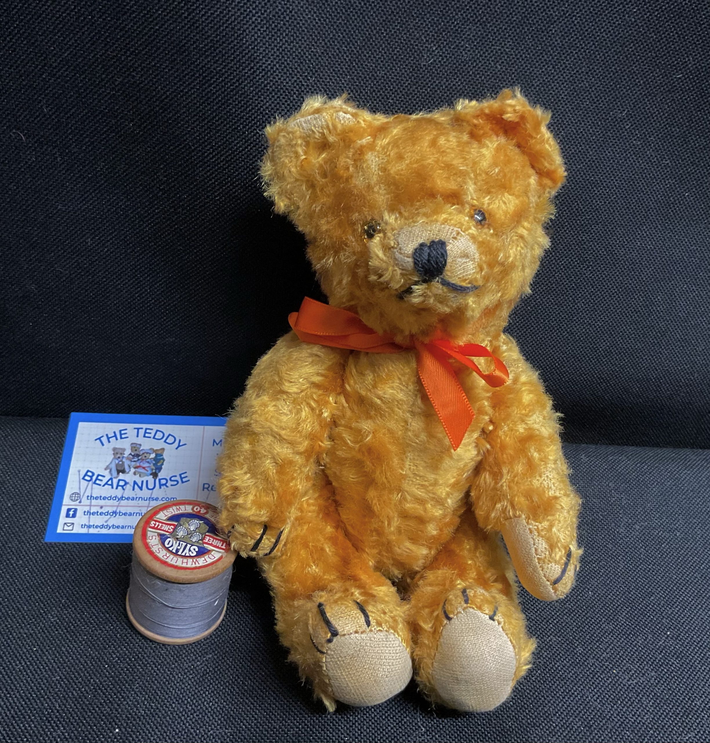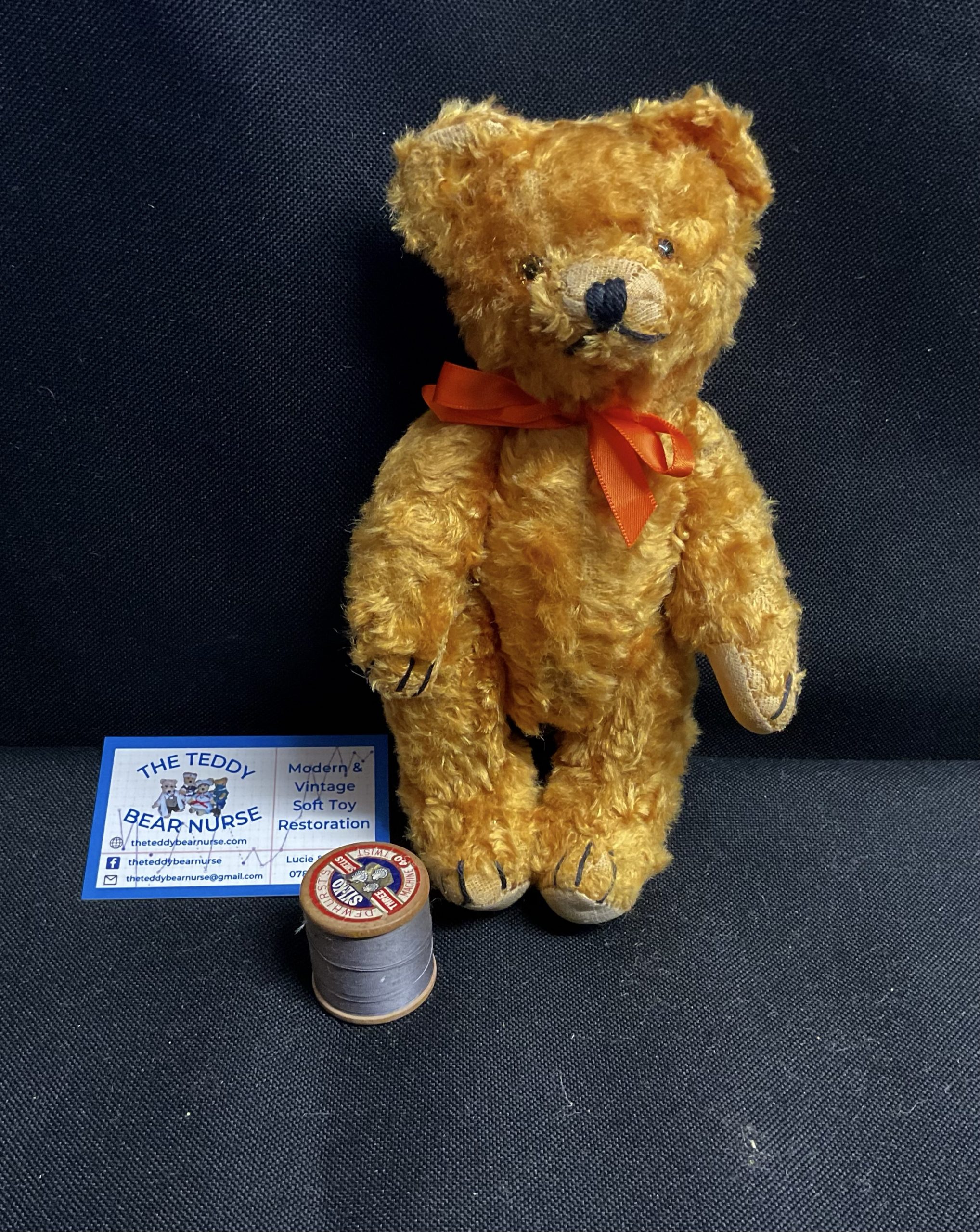 Butterscotch Vintage Eastern European Teddy. Cotton plush fully jointed with glass eyes. Original cotton pads. Wood wool filled. Stands at only approximately 22cm