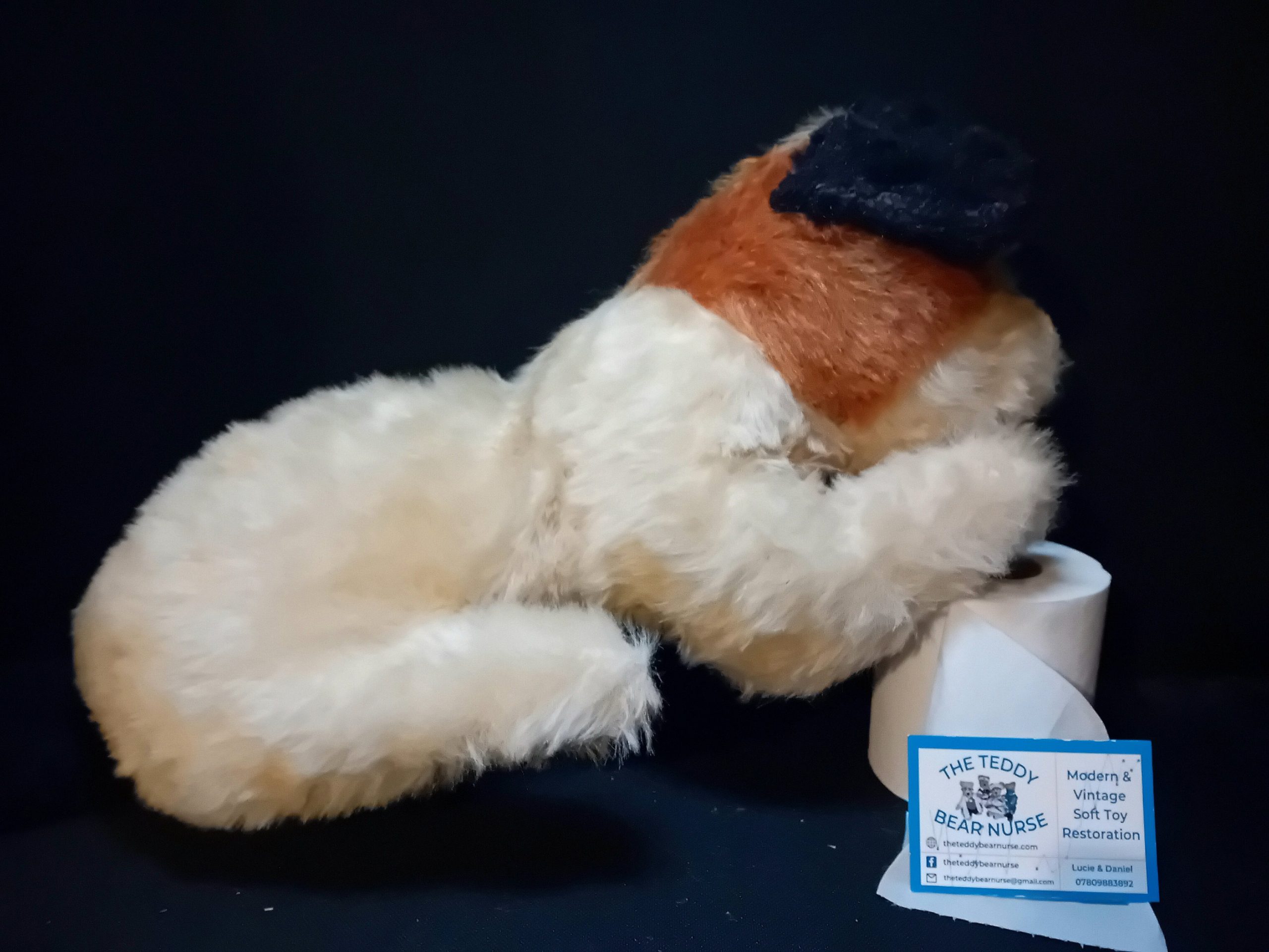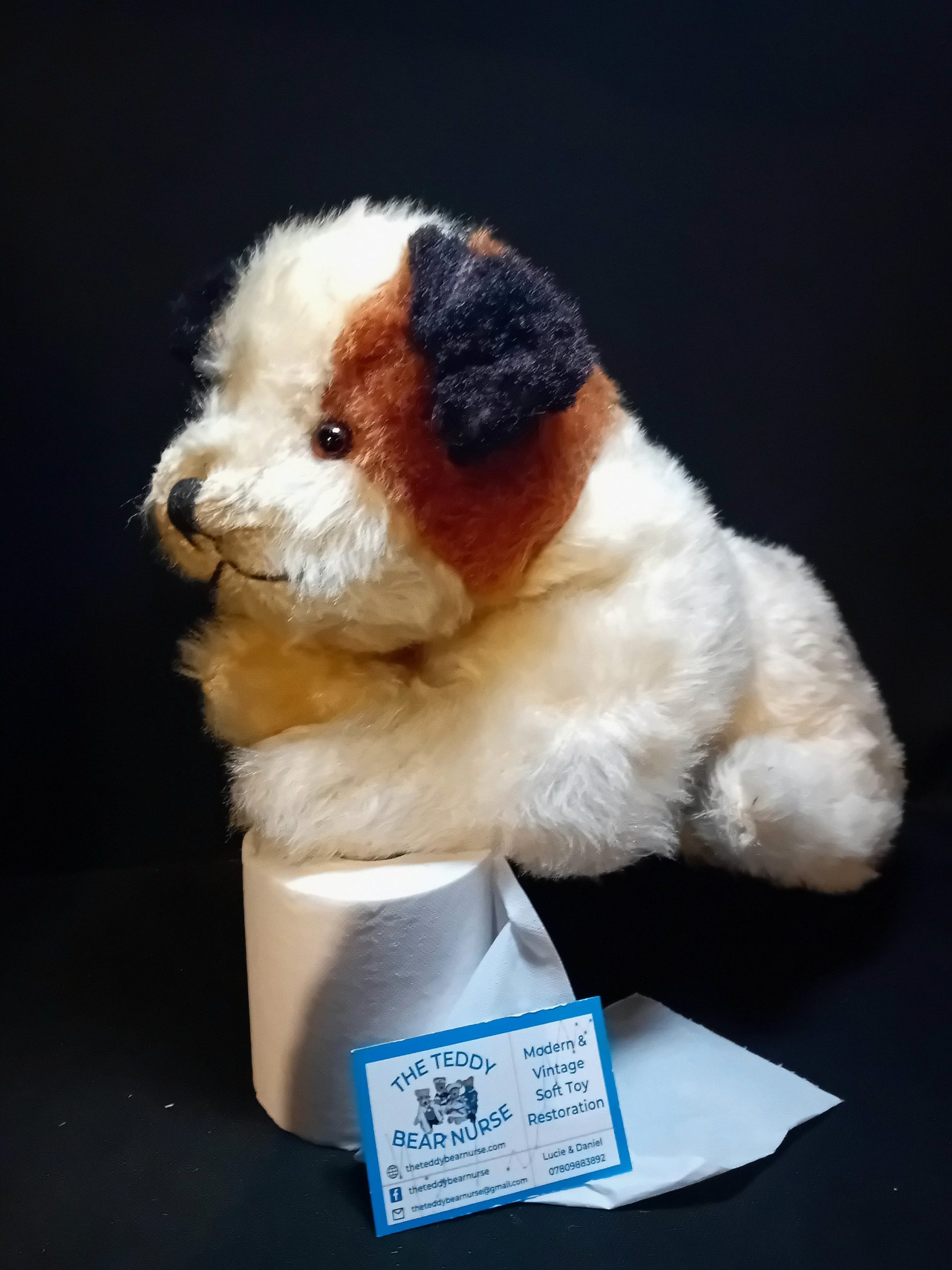 Ian Vintage mohair dog. Originally a pajama case, he has been stuffed now but retains his working zip underneath. Glass eyes. clean and repaired. aprox 43cm length.