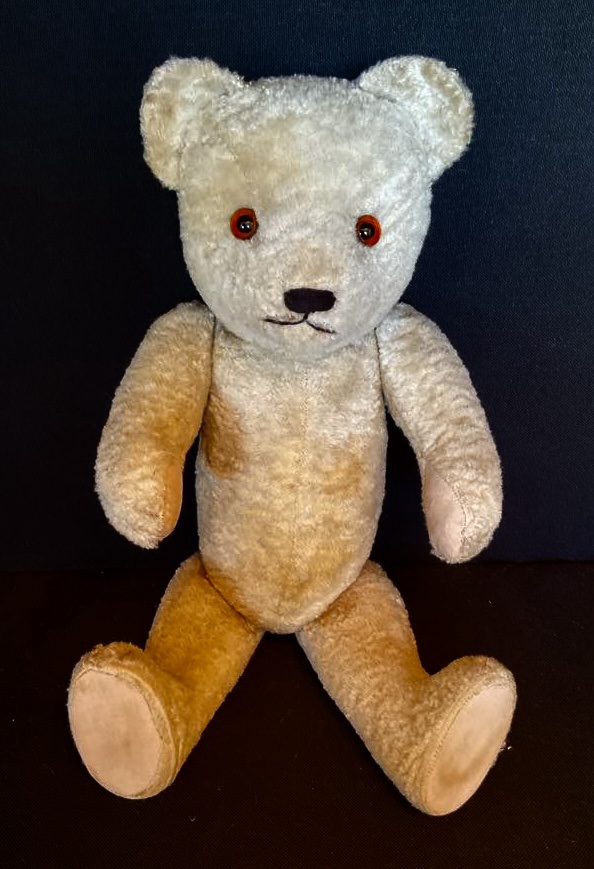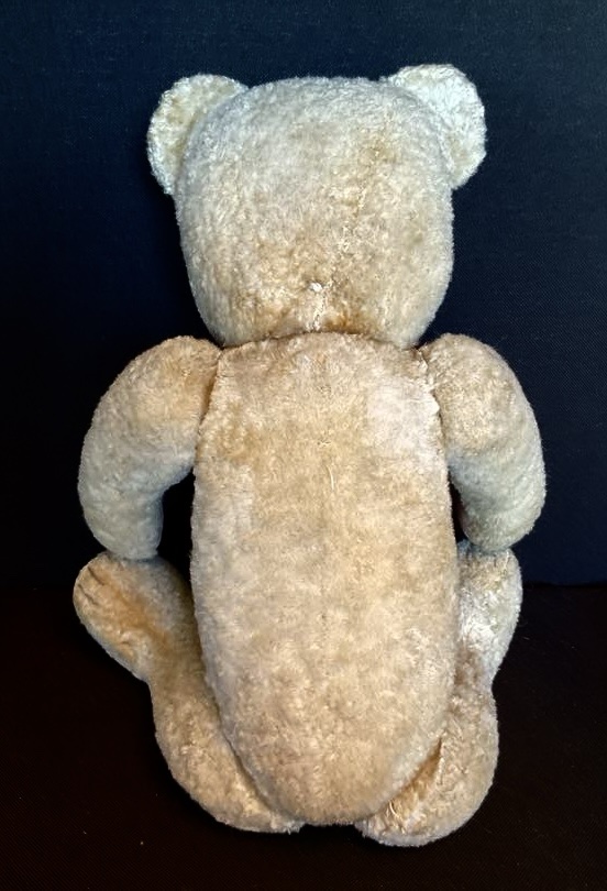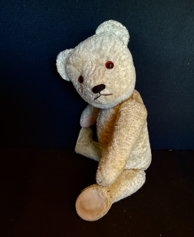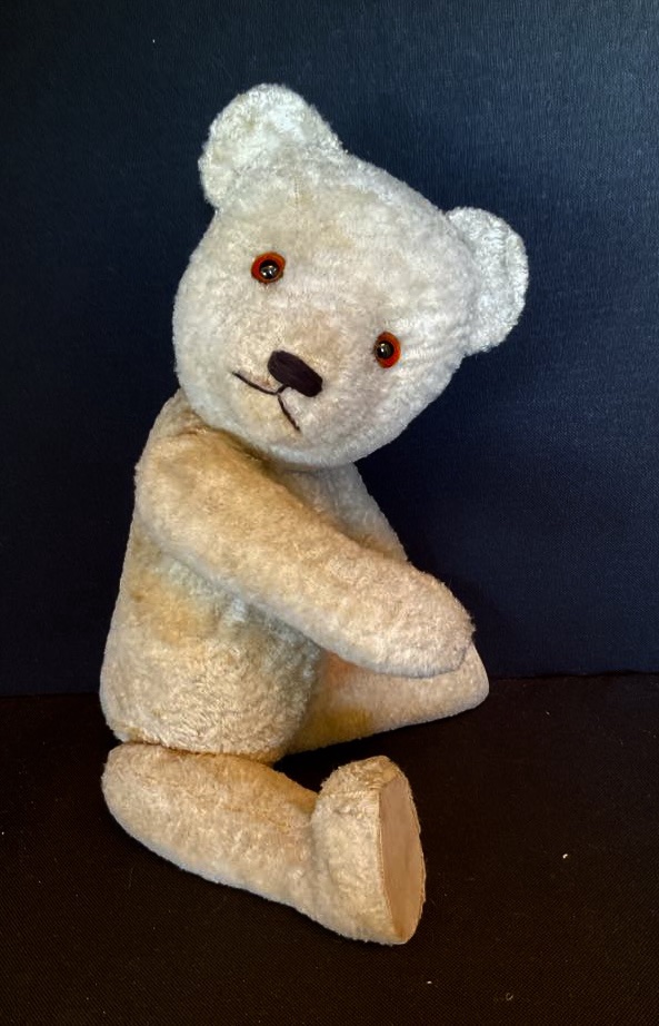 Ingrid Very well made vintage German bear made by Gokra in 1940/50s. Distinctive teardrop shaped original cotton paw pads. Fully jointed with glass eyes in soft cotton plush, excelsior filled. Lovely rarer cream colour, stands at approximately 44cm. Cleaned checked over and ready for a collector.