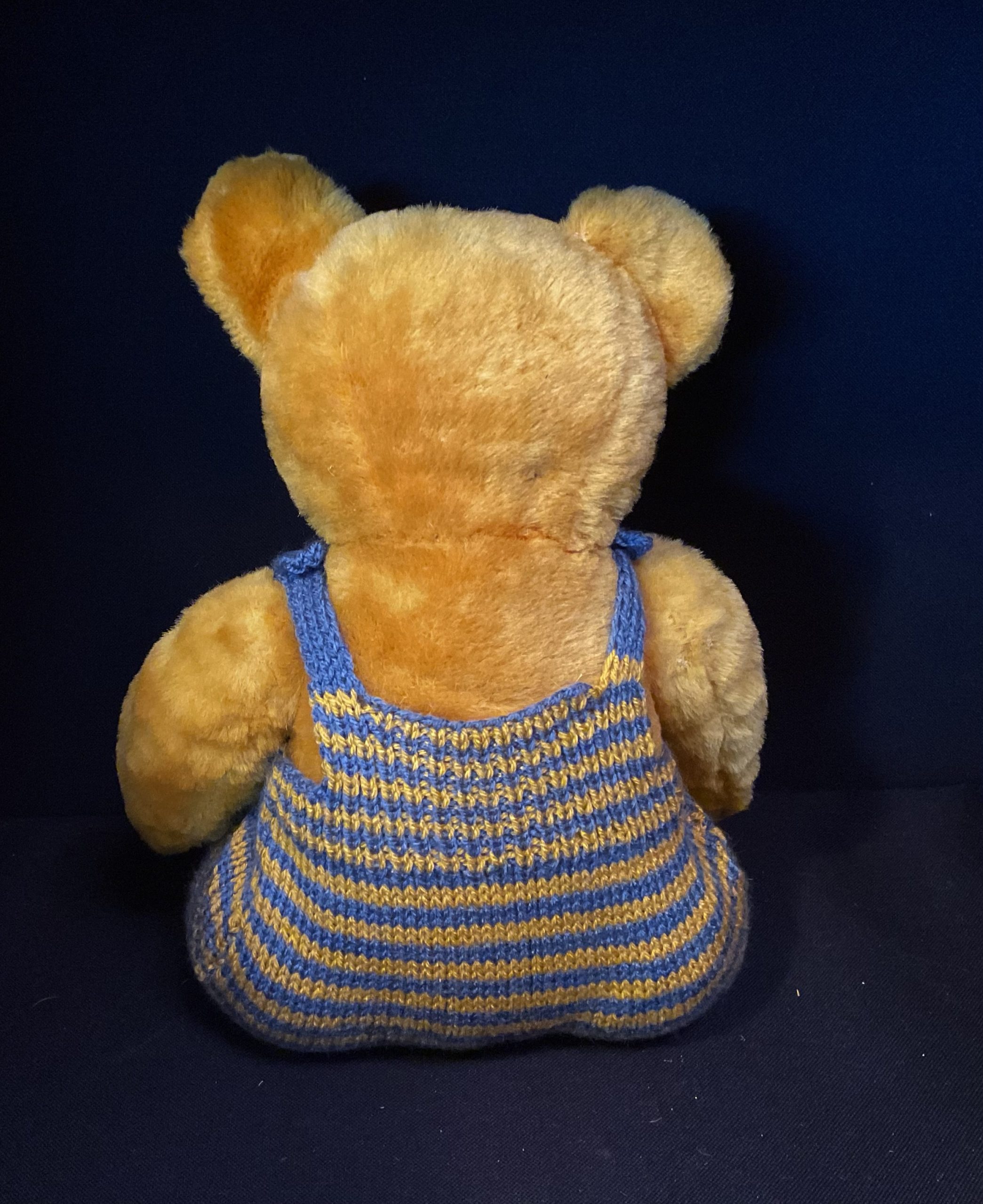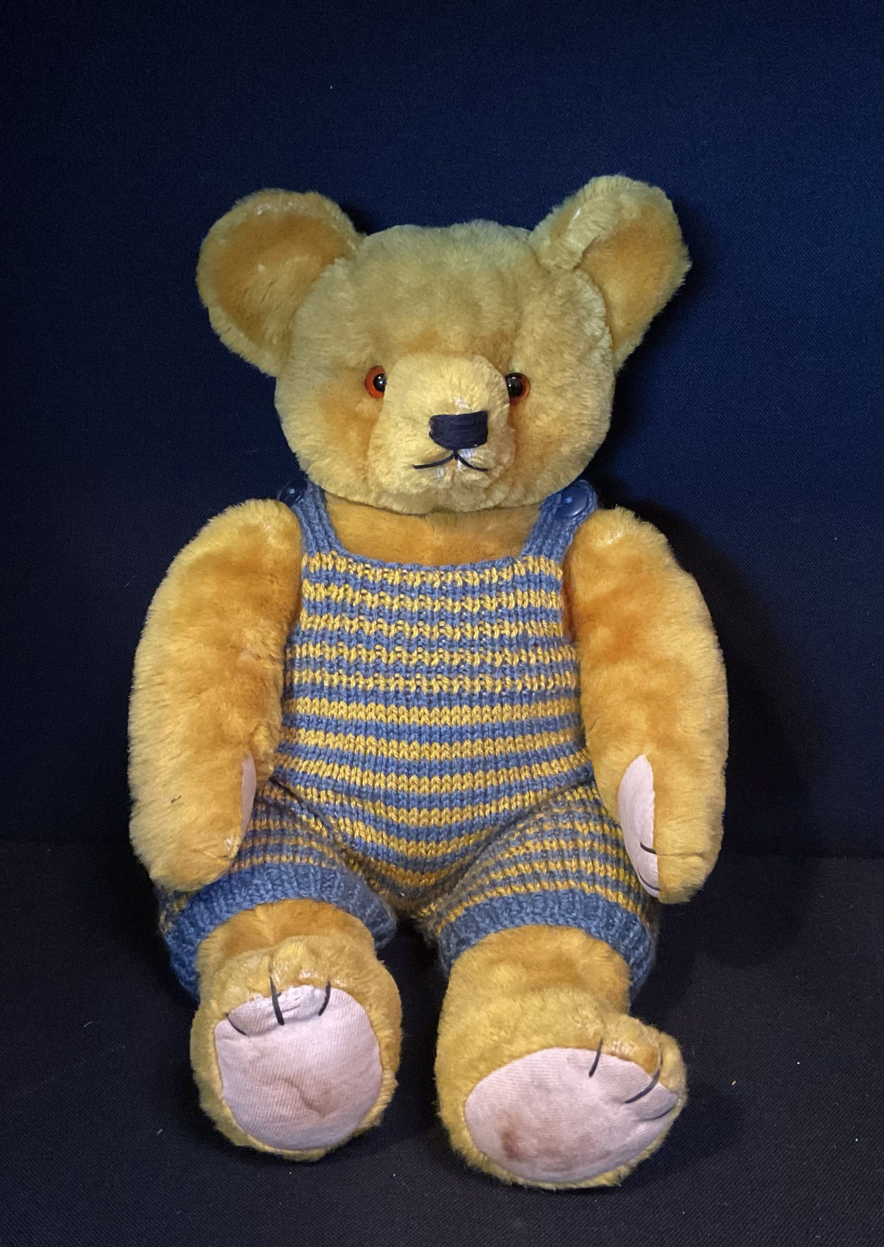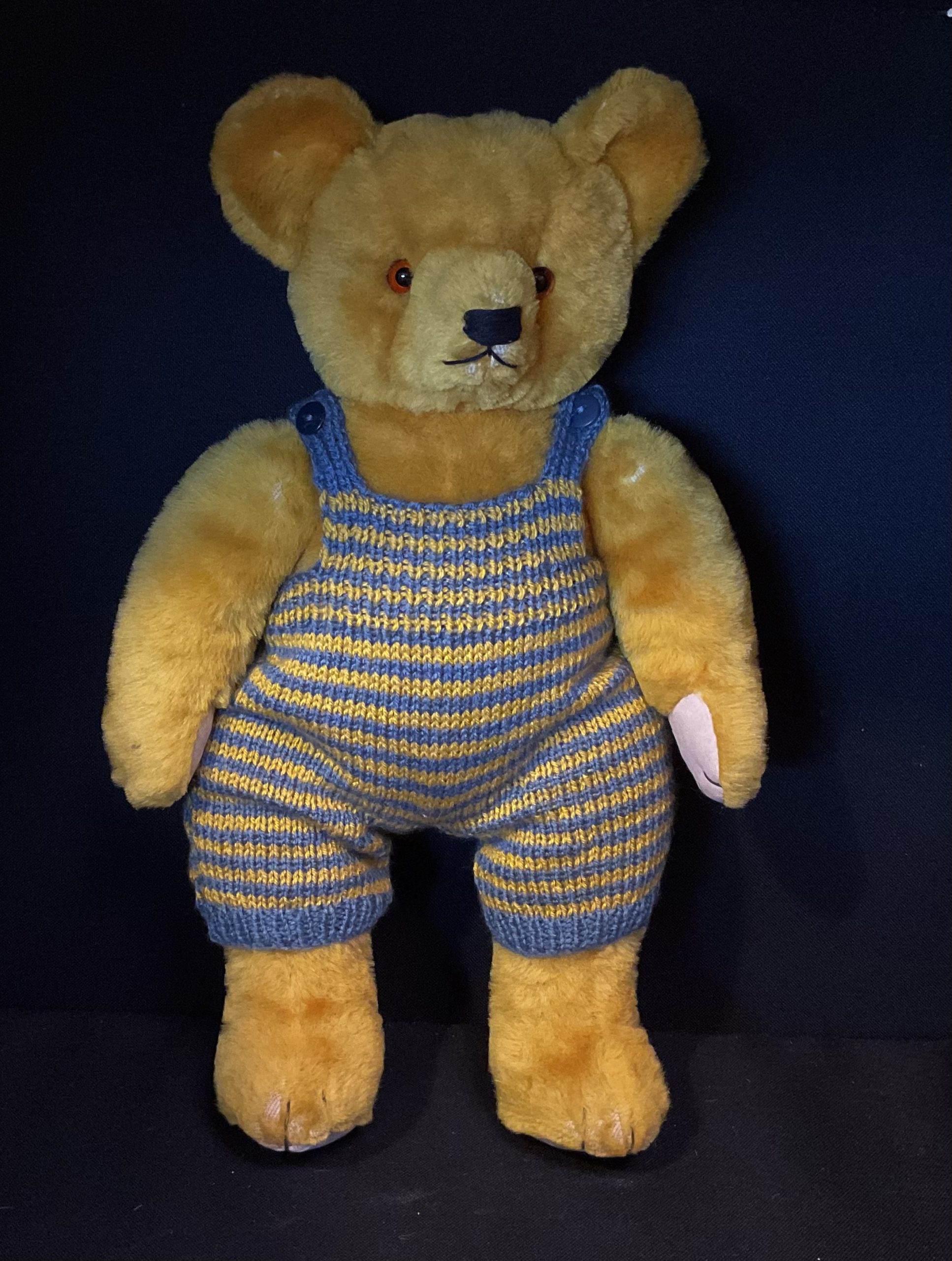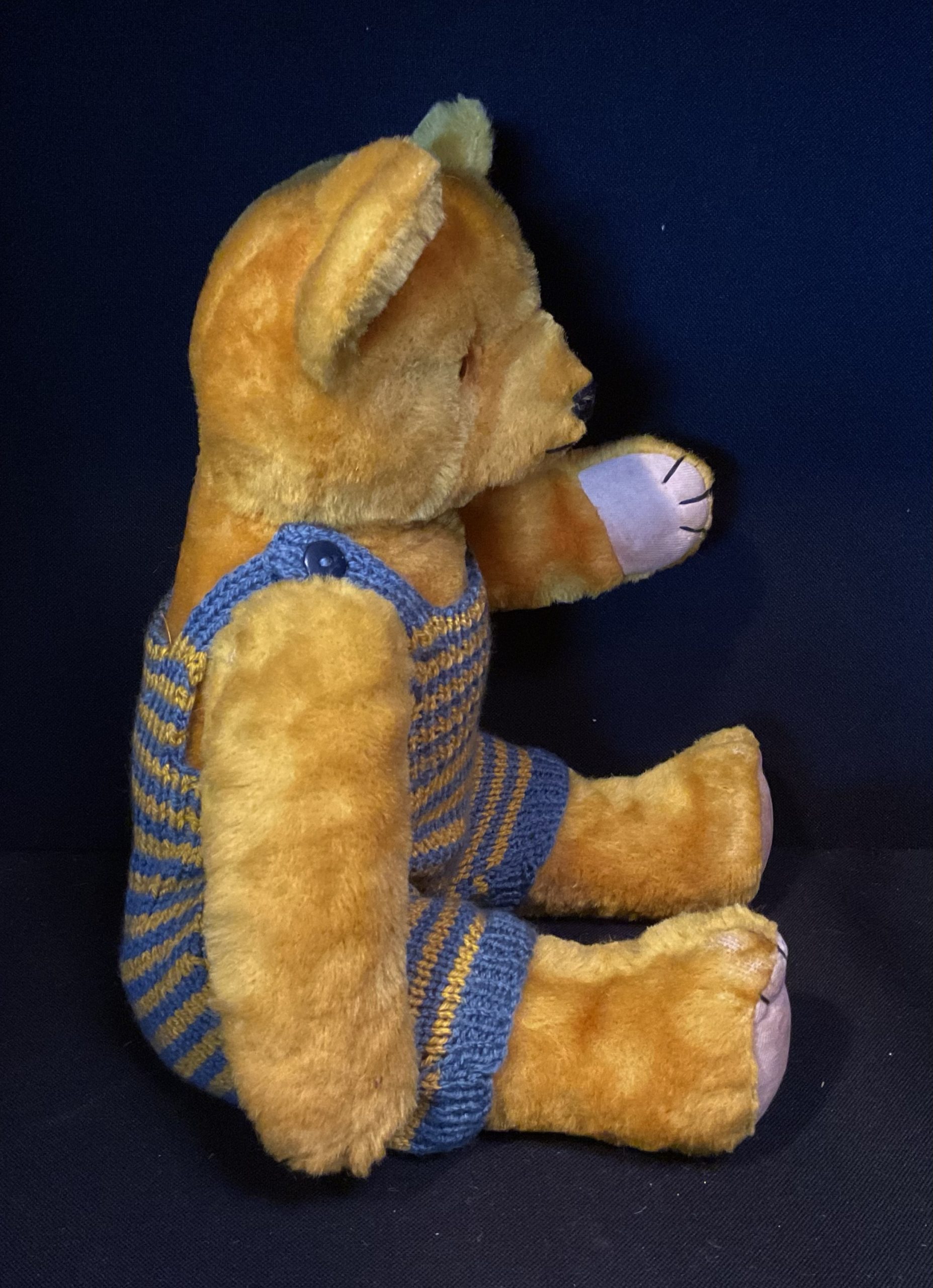 Ronnie Vintage 1960s Shanghai doll factory teddy. Wool/mohair, firmly stuffed with glass eyes and moveable limbs. Retains his bright yellow gold colour which is complimented by the hand knitted dungarees. Approximately 43cm tall