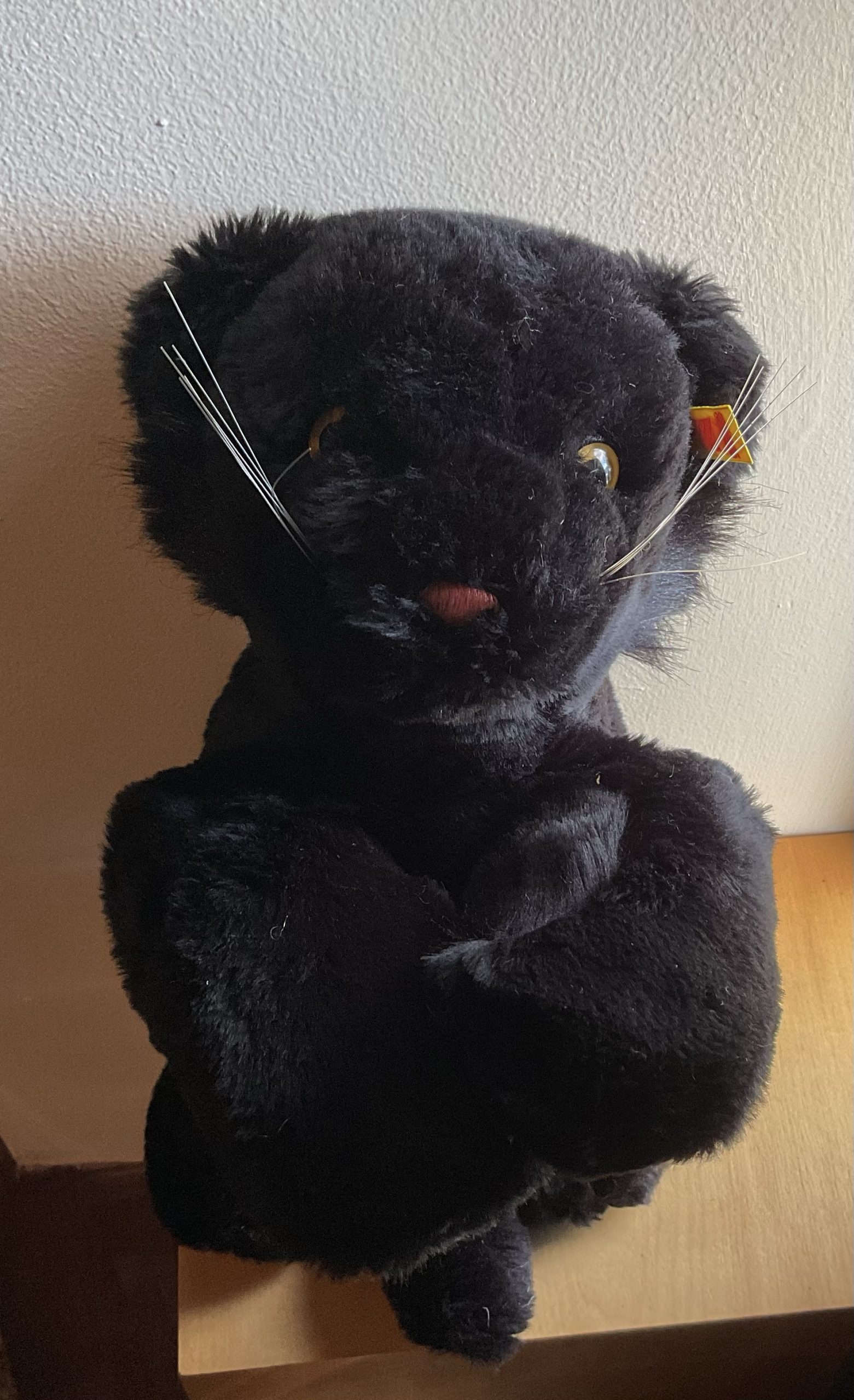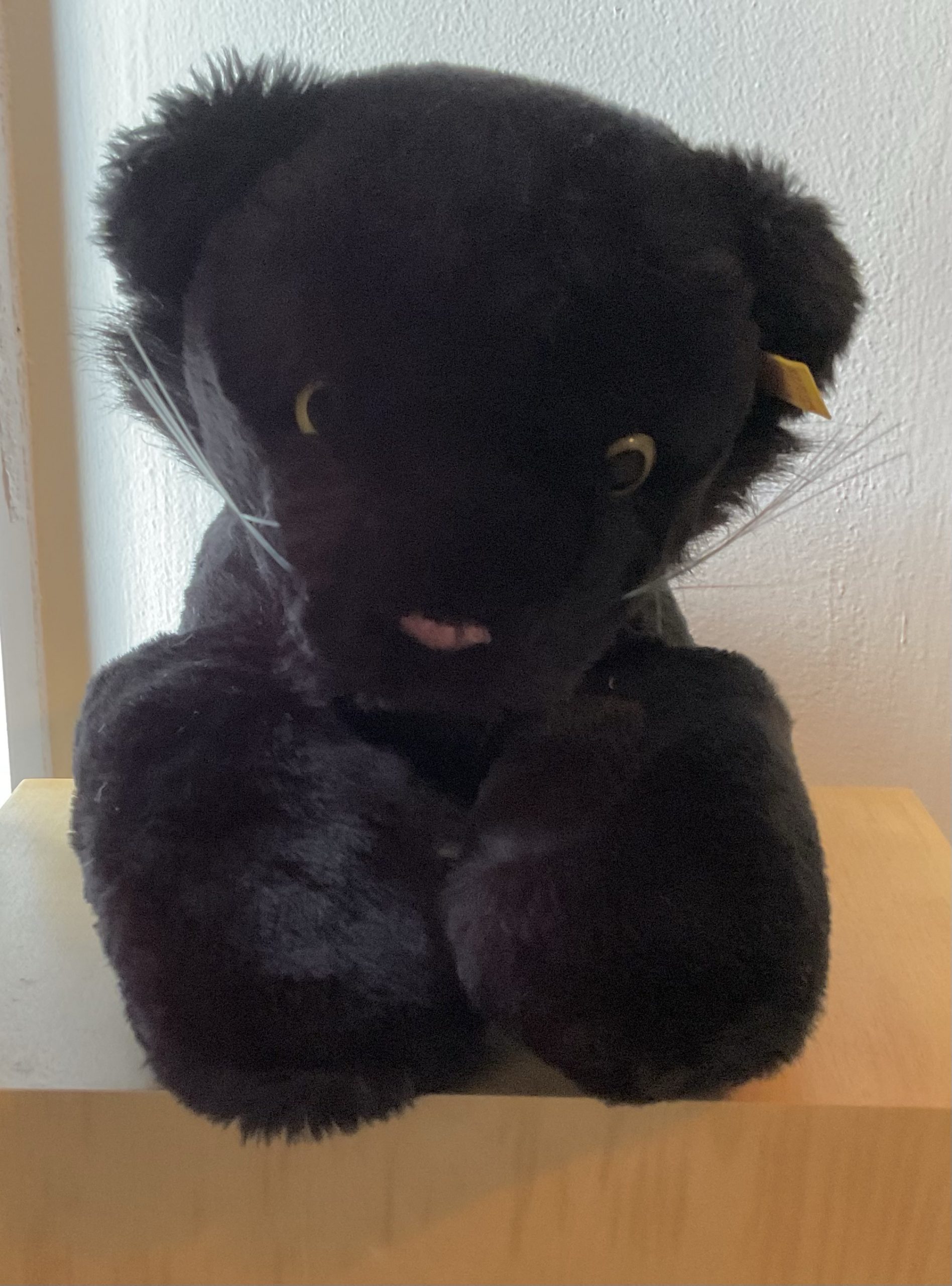 Steiff cosy panther Ean 5370/28 black vintage super soft vintage panther in laying down position. Button and tag. Dates from 1980s great original condition. Length aprox 35cm