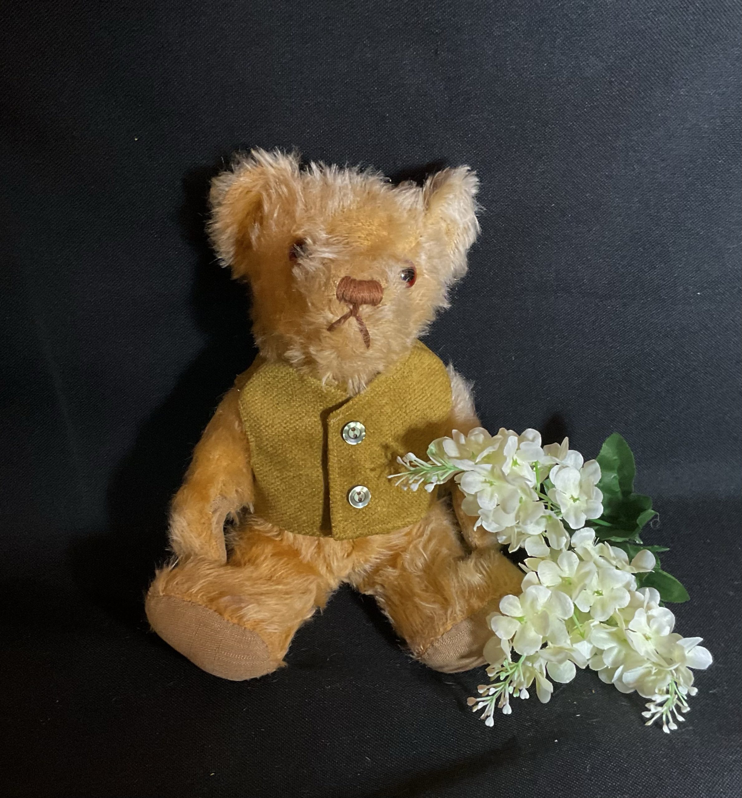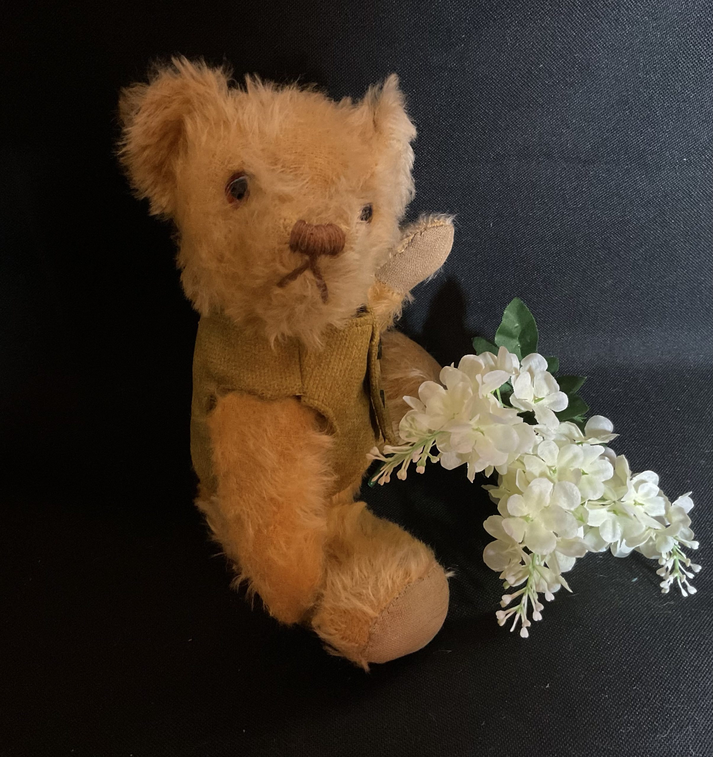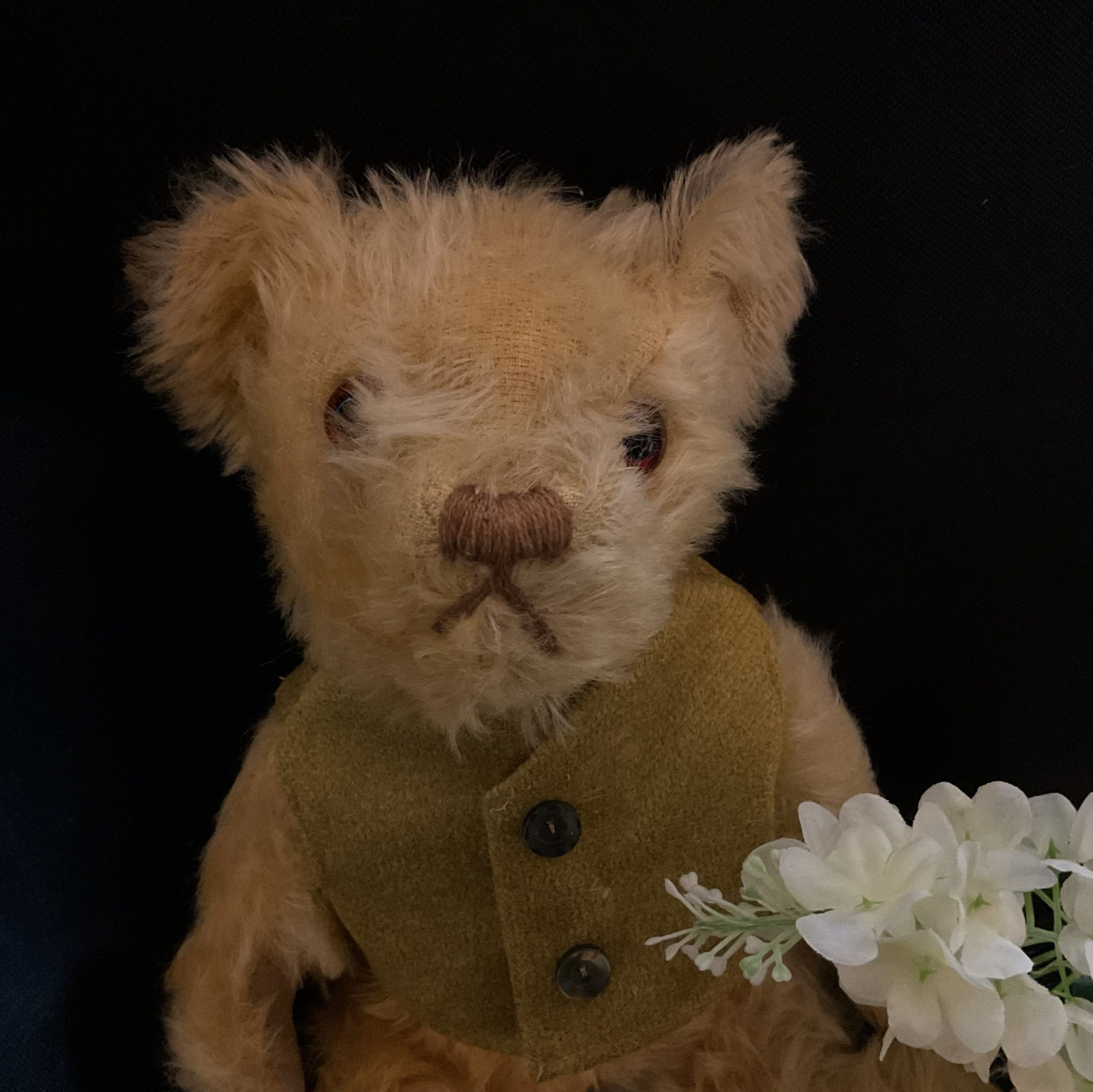 Victor Vintage 1940s/50s Invicta Teddy. Long blonde mohair, original glass eyes and distinguishing brown thread nose and mouth. Fully jointed. Cleaned and moth treated. Original squeaker in tummy, but not working. Stands at approximately 28cm